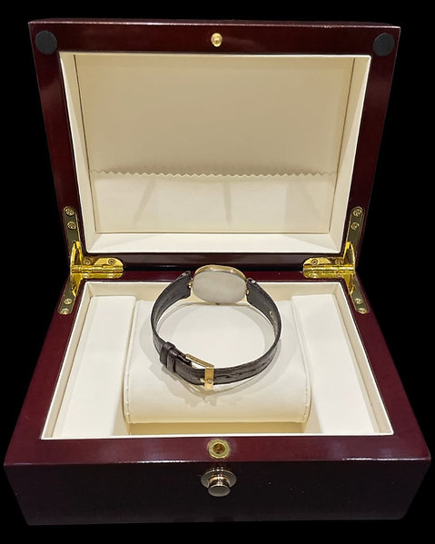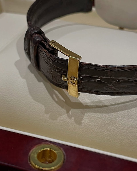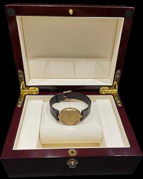 Preowned Vintage- A Rare Royal Masterpiece From The Prestigious Swiss House Of O^mega – A Very Special Edition From 1980, Created In Honor Of His Majesty King Abdulaziz Al Saud, The Founder Of The Kingdom. This elegant timepiece features the Saudi Royal Emblem and the name of the King engraved at the heart of the dial. Gold-plated, 31mm in diameter, Quartz movement – from the distinguished De Ville collection, embodying timeless elegance and classic refinement. A watch that carries the essence of history and the luxury of legacy – one of the rarest commemorative editions, Replaced Leather Strap- In Excellent Condition
