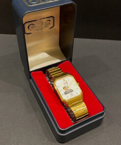 The watch features a bronze case with a refined rectangular design that reflects the political grandeur of its time. Its dial is adorned with a shimmering ivory face, showcasing a finely illustrated portrait of the president – a visual chronicle of a pivotal era in Iraq’s modern history with a distinguished ceremonial character.