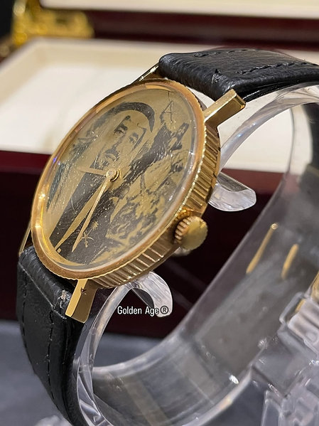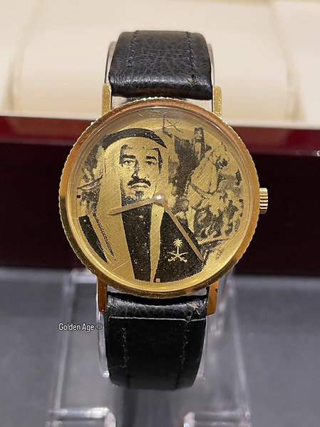 Preowned Vintage 1975 – A Highly Limited Royal Edition, Commissioned At The Dawn Of The Reign Of The Custodian Of The Two Holy Mosques, King Khaled Bin Abdulaziz 1965A Luxurious Swiss Automatic Watch With Manual Winding, Gold-Plated, And Preserved In Exceptional Condition — With A Perfect 36mm Case Size.The Dial Is Embellished With A Magnificently Detailed Royal Portrait, Alongside The Emblem Of The Kingdom Of Saudi Arabia — A Rare Embodiment Of Grandeur And Sovereignty.
