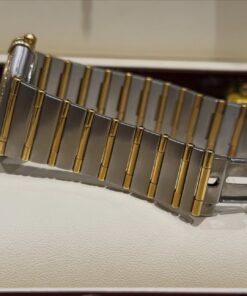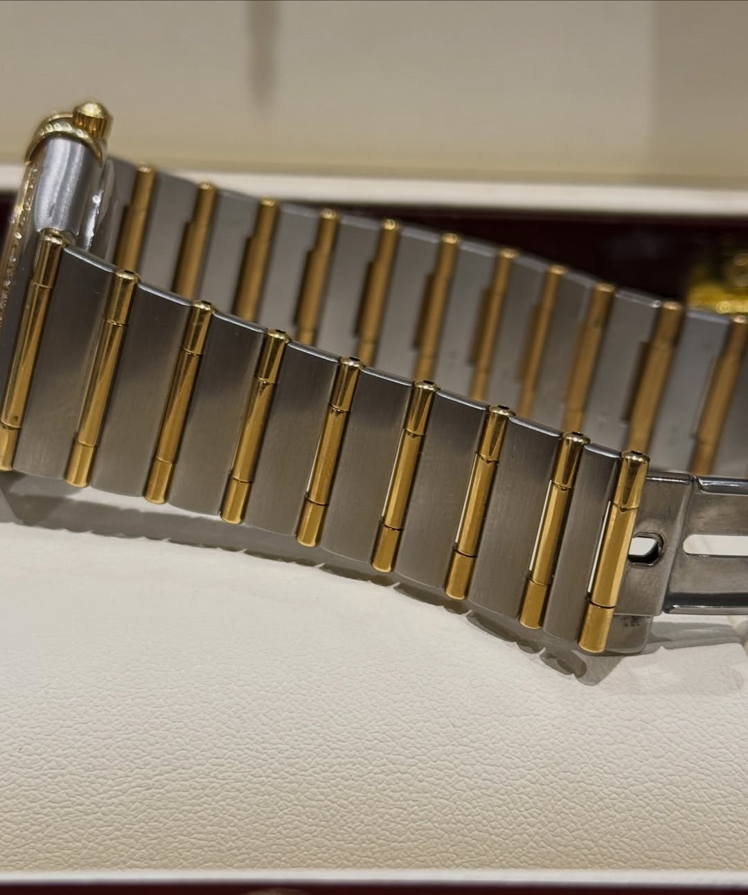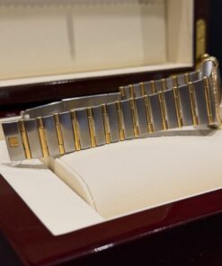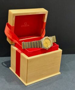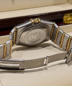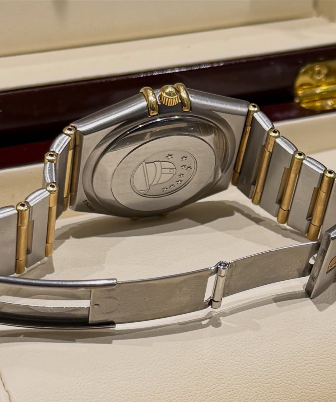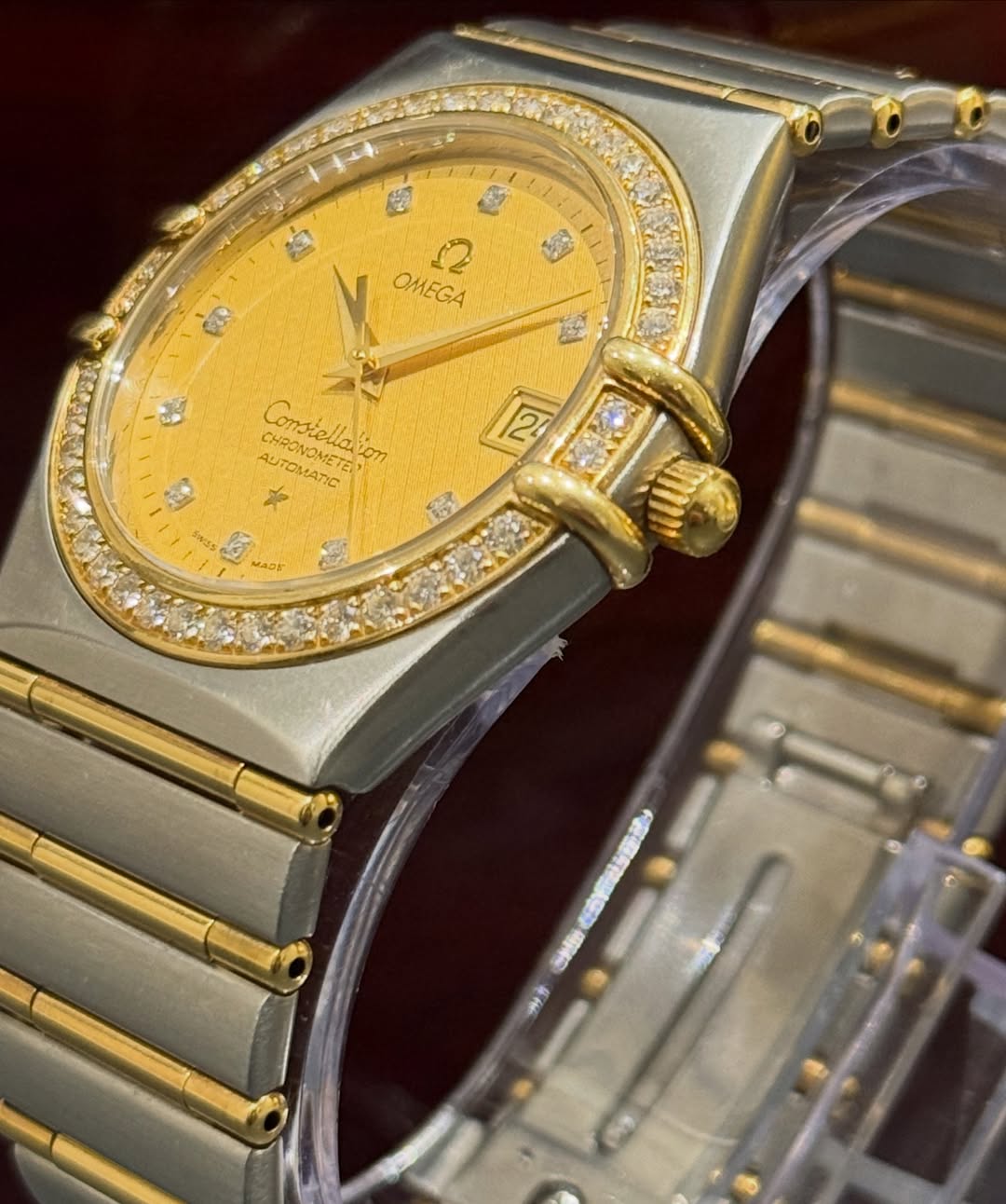 Preowned – Genuine – A piece not introduced as a watch… but as a presence worn. automatic Omega Constellation with a true jewelry identity, where gold and steel meet in soft classical harmony, surrounding a sandy-gold dial set with inner diamonds, completed by an outer bezel crowned with a gentle brilliance that radiates aristocratic elegance without excess.