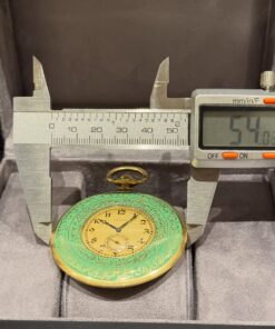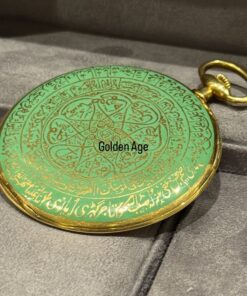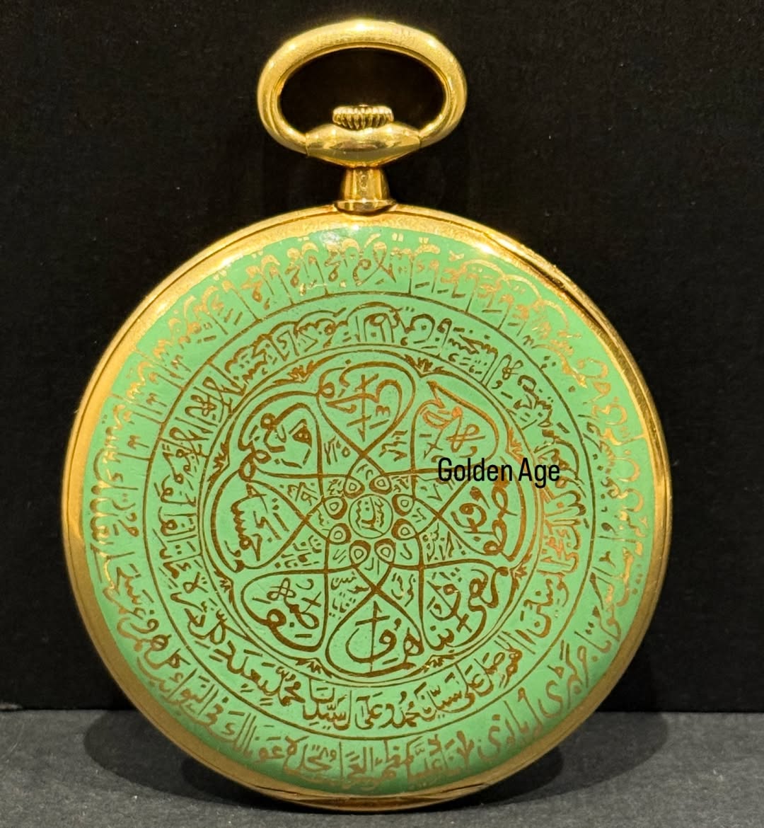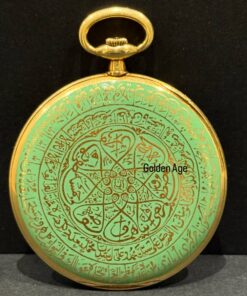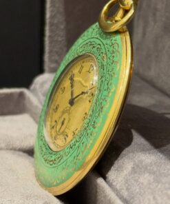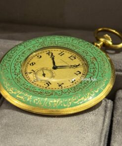 Crafted entirely in solid 18K gold – 83g – the case showcases remarkable dual-sided ornamentation featuring devotional verses and Ottoman talismanic scripts typical of the period, executed in refined Arabic calligraphy over a polished green dial that blends spiritual symbolism with regal authority.