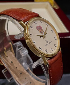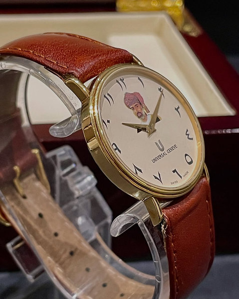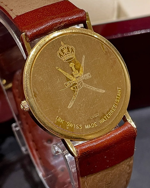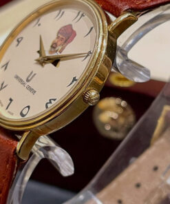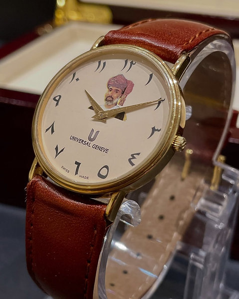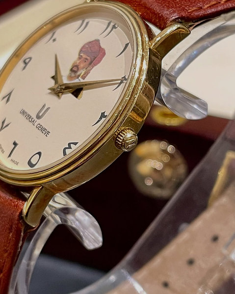Preowned Vintage – full gold masterpiece by the renowned Swiss house Universal Genève – Special Edition His Majesty Sultan Qaboos Oman.This rare edition showcases traditional Eastern Arabic numerals and the golden emblem of the Sultanate, presenting a majestic scene that blends luxury .The watch is crafted entirely from solid gold, and the caseback is engraved with the emblem of the Sultanate in fine detail — making it one of the rare sovereign pieces granted only to carefully selected individuals. A true jewel of time, suited for connoisseurs of distinction and collectors of royal emblems – 35mm in size, quartz movement, fitted with a newly added leather strap, and preserved in excellent overall condition