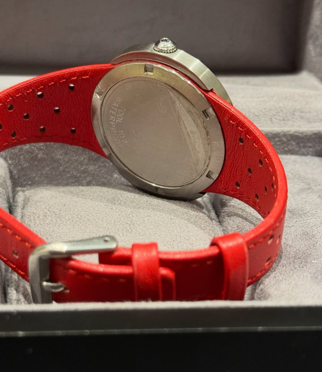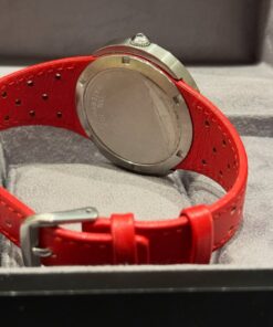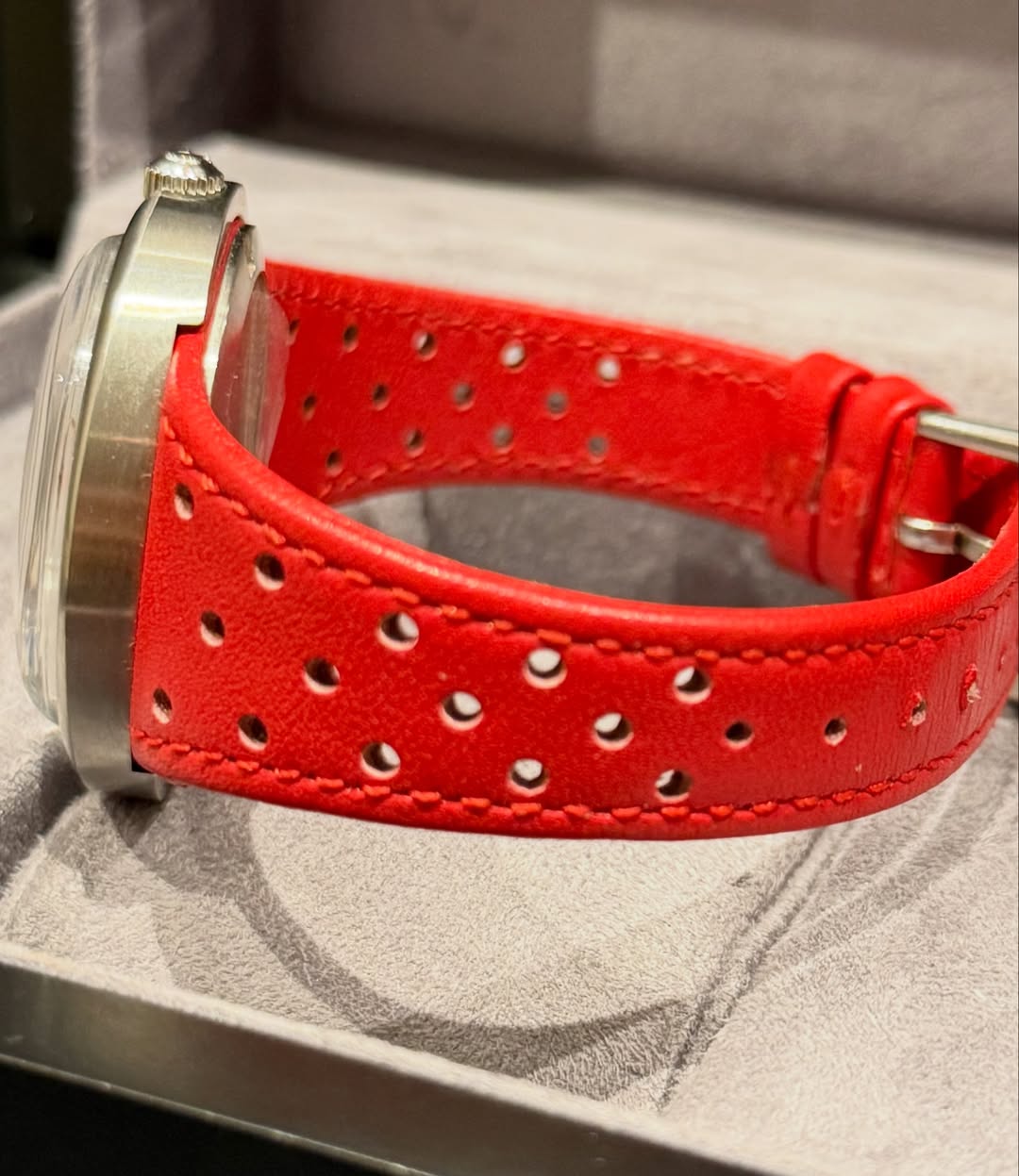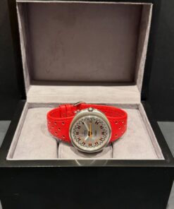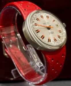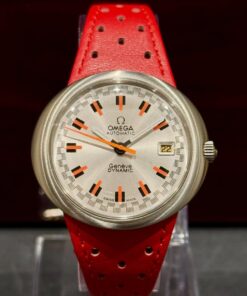 Its stunning silver dial bursts with vibrant orange and black markers, paired with harmonized hands that embody the precision and dynamism of the Omega Dynamic line. The perforated red strap adds a refined sporty flair that bridges the past and the future with effortless grace.