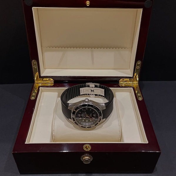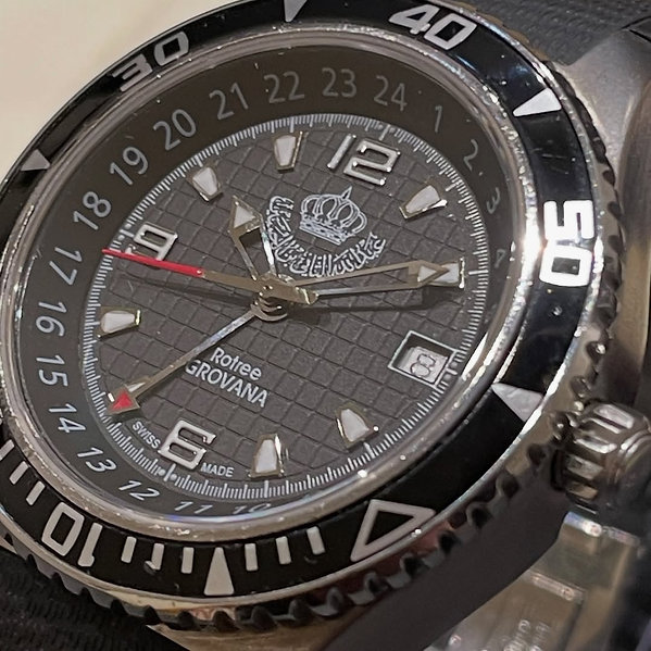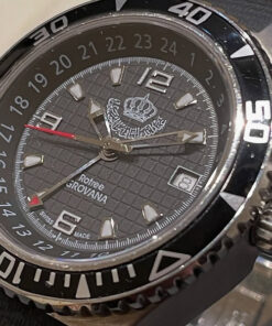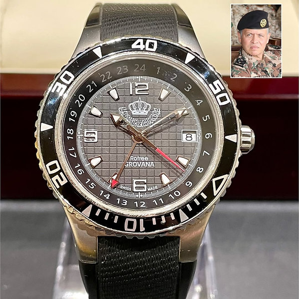 Preowned Royal Masterpiece Par Excellence – Special Edition Honoring His Majesty King Abdullah II – A Military-Inspired Sports Timepiece By Swiss Brand Grovana, Featuring The Royal Crown And The Name Of His Majesty King Abdullah II On A Refined Grey Dial. Sized At 41MM And Equipped With A Dual-Time GMT Function-Quartz- Rubber Strap- In Excellent Condition