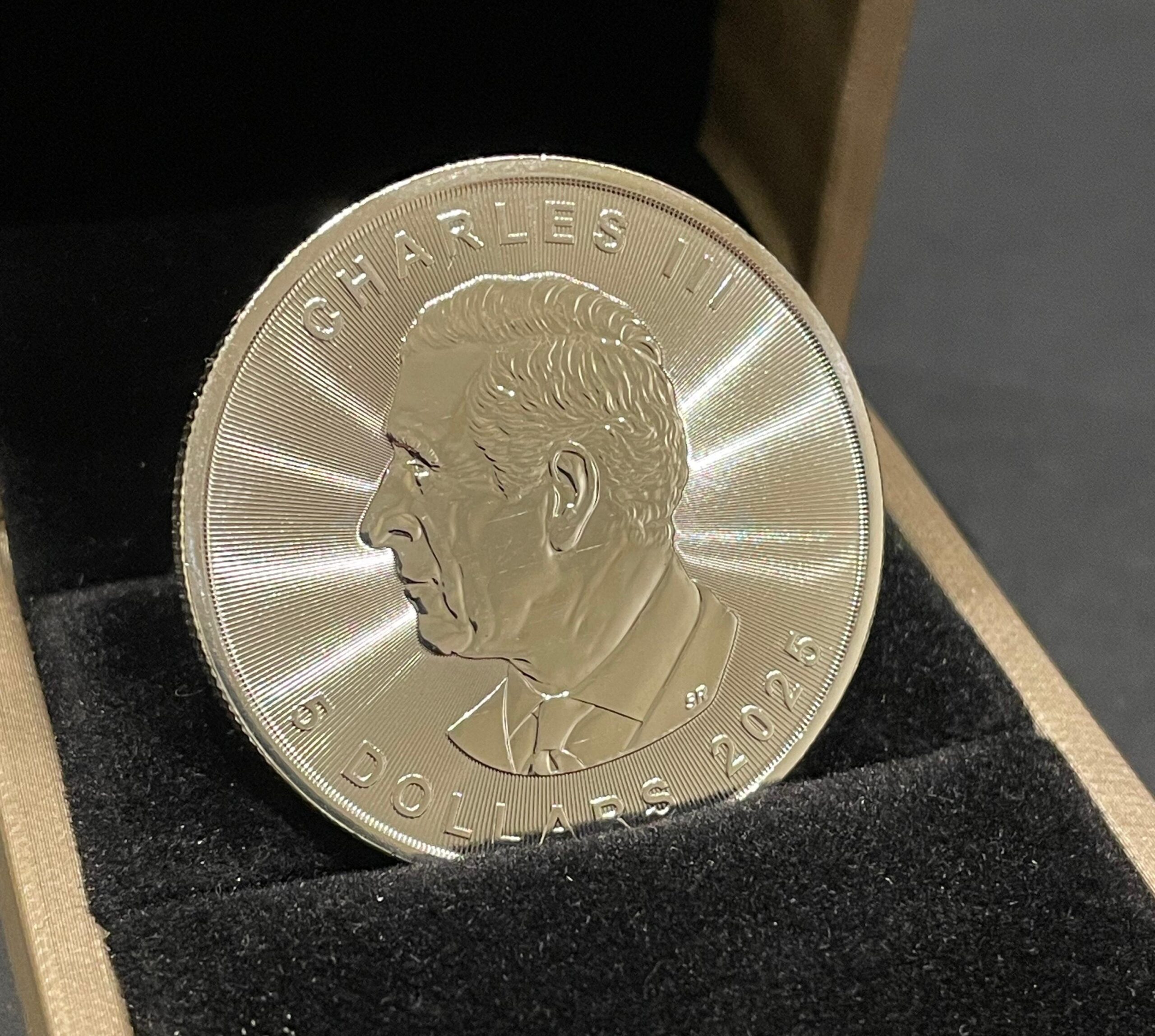 A premium bullion coin minted by the Royal Canadian Mint for the year 2025, featuring the effigy of King Charles III on the obverse and the iconic Maple Leaf design on the reverse — one of the most recognized silver coin designs globally.