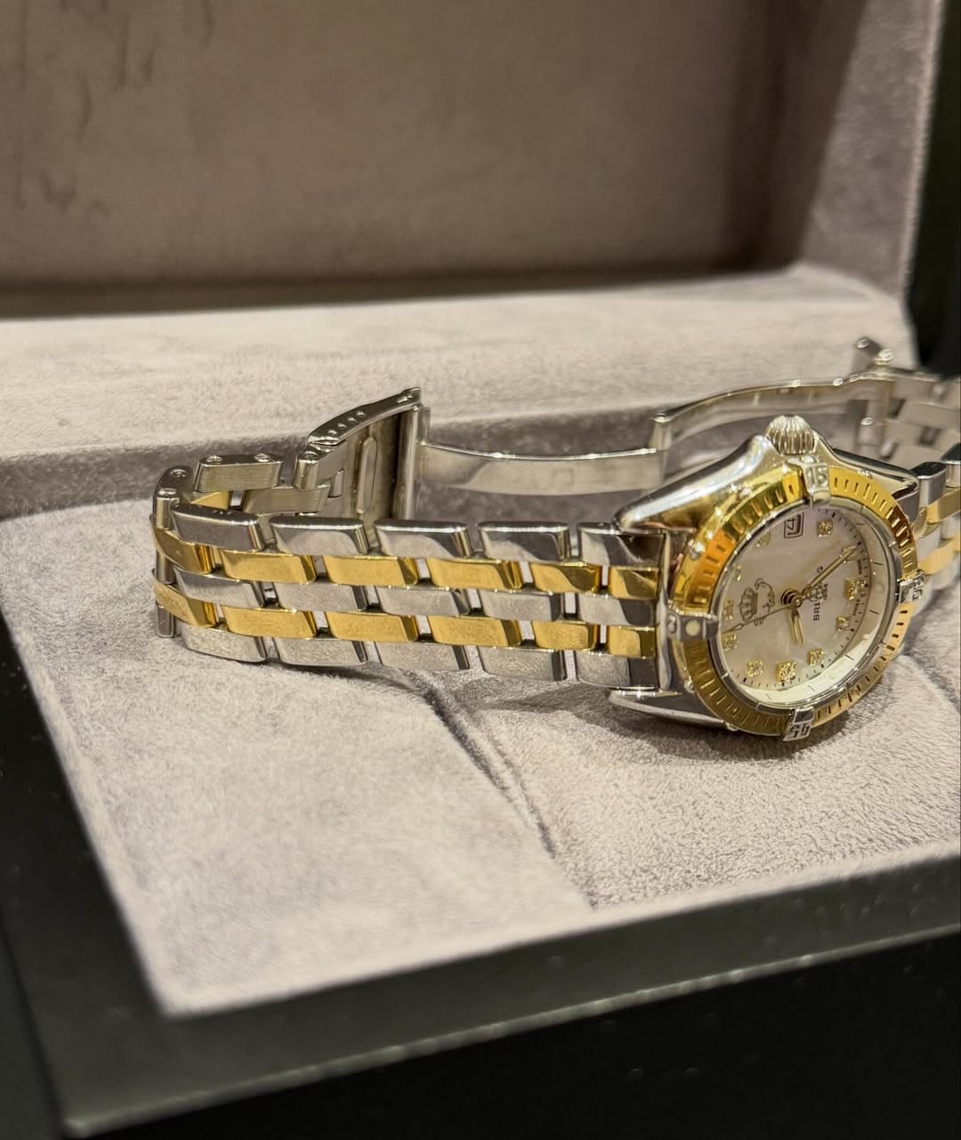 The watch features an elegant case crafted from stainless steel and yellow gold, complemented by a natural mother-of-pearl dial adorned with genuine diamond hour markers, radiating a perpetual royal brilliance. Powered by a highly precise Swiss Made Quartz movement and measuring 27mm, it strikes the perfect balance between refined presence and luxurious detail.