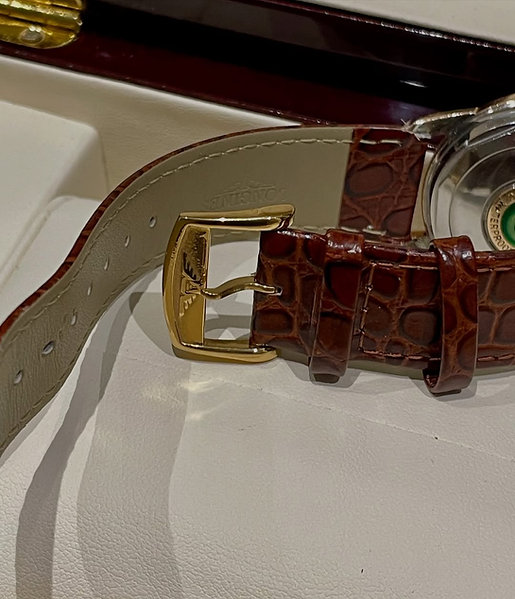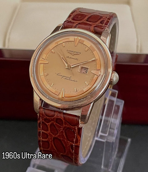 Preowned Genuine Vintage Rare Swiss Jewel From Longines – Conquest Calendar Edition, 1960 classic that embodies the pride of Swiss craftsmanship in the 1960s. This remarkable piece features a refined design that harmoniously combines rose gold and stainless steel, granting it a majestic presence on the wrist. It is distinguished by a luxurious rose champagne dial, adorned with fine gold hands and markers, and features an elegant date window at three o’clock – all within a classic layout that reflects the elegance of its era. 35mm case and a reliable automatic movement, this watch represents a timeless model that fuses artistic heritage with mechanical precision.